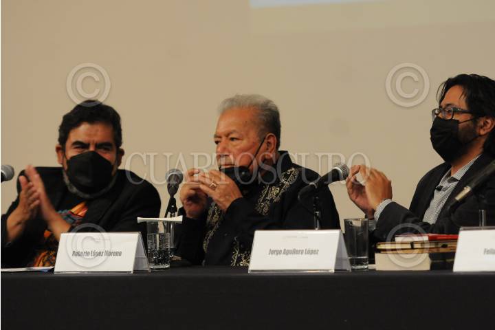 CIUDAD DE MÉXICO, 09NOVIEMBRE2024.- El poeta Mardonio Carballo, Rodolfo González Martínez, versado y músico, y Mauricio Gómez Morín, ilustrado del libro “Chén Che Re”, durante la presentación del mismo escrito en lengua española, inglés y nahua. La presentación se realizó en La Casa Universitaria del Libro de la Universidad Nacional Autónoma de México (UNAM) en compañía de amigos, público en general e invitados especiales. FOTO: GALO CAÑAS/CUARTOSCURO.COM