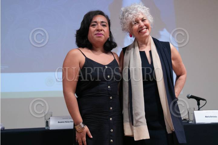 CIUDAD DE MÉXICO, 12MAYO2024.- La poeta Beatriz Pérez Pereda, ganadora del Premio Iberoamericano Bellas Artes de Poseía Carlos Pellicer, ofreció una palabras de su obra ganadora "Persona no Humana", en la Sala Manuel M. Ponce del Palacio de Bellas Artes. La acompañó la también poeta María Baranda. FOTO: MOISÉS PABLO/CUARTOSCURO.COM