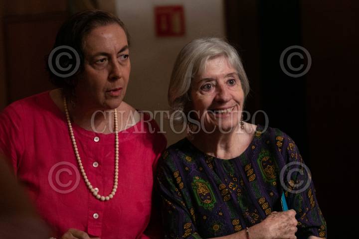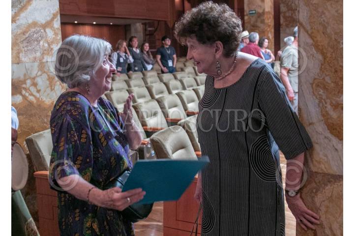 CIUDAD DE MÉXICO, 09JUNIO2024.- Las escritoras Alicia García Bergua y Margo Glantz conversan al finalizar la ceremonia en donde se reconoció el trabajo de la primera, en el Palacio de Bellas Artes. FOTO: MOISÉS PABLO/CUARTOSCURO.COM