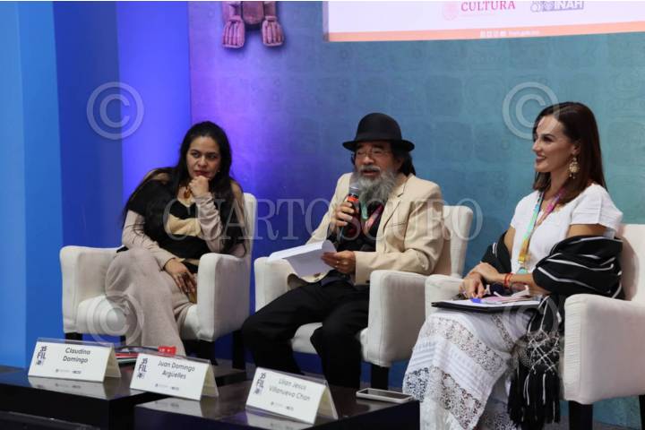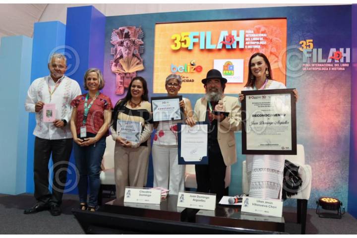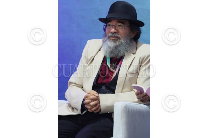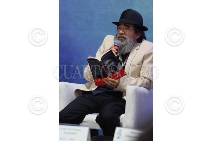 CIUDAD DE MÉXICO, 18AGOSTO2024.- En el último día de actividades de la 35 Feria Internacional del Libro de Antropología e Historia (FILAH), la Secretaría de Cultura del Gobierno de México, a través del Instituto Nacional de Antropología e Historia (INAH), y el Gobierno de Quintana Roo otorgaron un reconocimiento al poeta y ensayista chetumaleño, Juan Domingo Argüelles (1958), por sus aportes a la literatura mexicana y a la cultura quintanarroense. La titular de la Coordinación Nacional de Difusión (CND) del INAH, Beatriz Quintanar Hinojosa; la directora del Instituto de la Cultura y las Artes de Quintana Roo, Lilian Jesús Villanueva Chan, y el director general del Instituto Geográfico y Catastral del Estado, Ricardo López Rivera, entregaron una estatuilla y un documento que resalta la trayectoria del también lexicógrafo. FOTO: INAH/CUARTOSCURO.COM