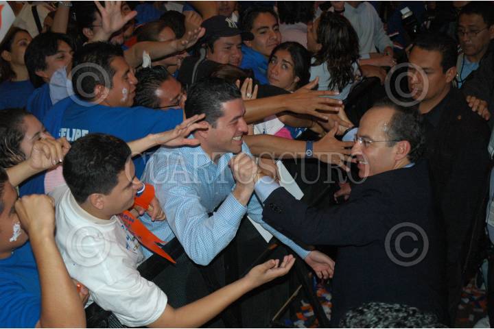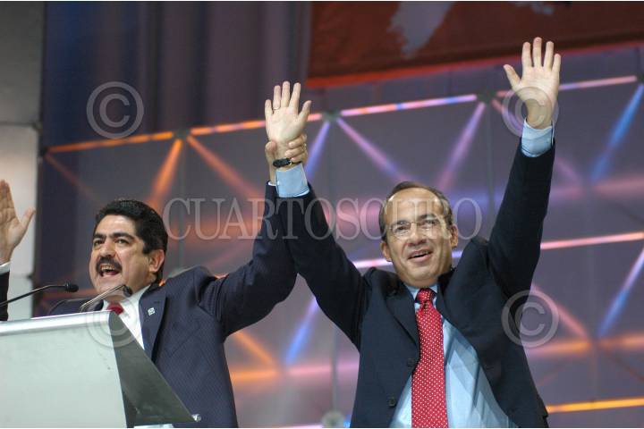 MEXICO, D.F. 04DICIEMBRE2005.- Manuel Espino, presidente nacional del PAN levanta el brazo de Felipe Calderón Hinojosa, candidato del PAN a la presidencia de la República. FOTO: Iván Stephens/CUARTOSCURO.COM