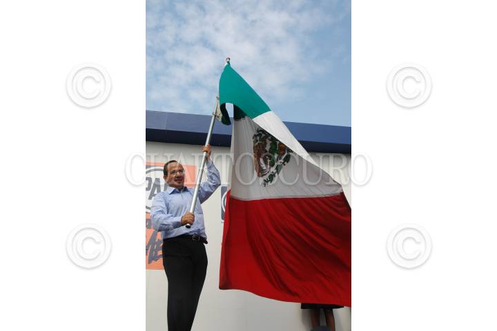 MEXICO, D.F. 04DICIEMBRE2005.- Felipe Calderón Hinojosa, ondea la bandera nacional al termino de la ceremonia de toma de protesta como candidato del PAN a la presidencia de la República. FOTO: Iván Stephens/CUARTOSCURO.COM