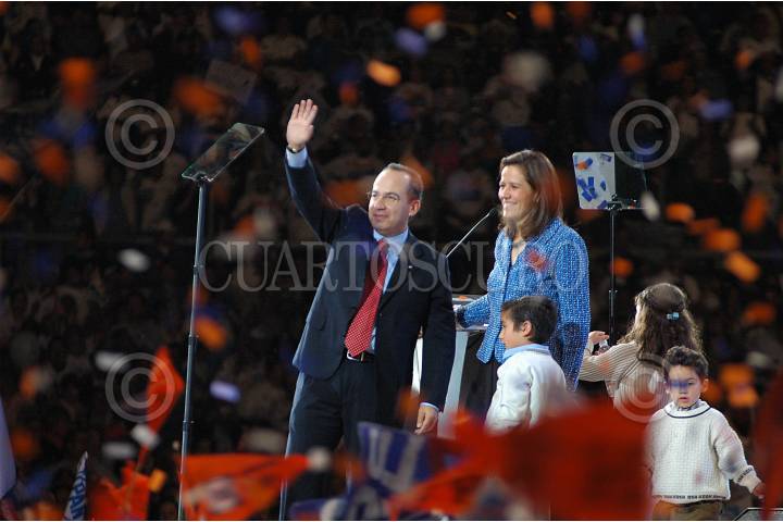 MEXICO, D.F. 04DICIEMBRE2005.- Felipe Calderón Hinojosa, acompañado de su familia saluda a la gente al termino de la toma de protesta como candidato del PAN a la presidencia de la República. FOTO: Iván Stephens/CUARTOSCURO.COM