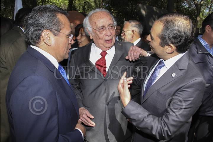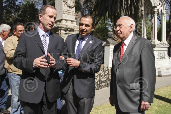 MÉXICO, D.F., 19MARZO2013.- Juan Manuel Oliva y Ernesto Cordero Arrollo, candidato a Secretario General y Presidente del Partido Acción Nacional, dialogan con Don Esteban Zamora durante la ofrenda floral en homenaje a Gómez Morin, como parte de inicio de campaña de Ernesto Cordero a la dirigencia blanquiazul. FOTO: CUARTOSCURO.COM