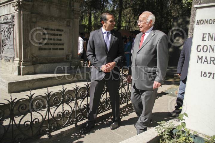 MÉXICO, D.F., 19MARZO2013.- Ernesto Cordero Arrollo y Don Esteban Zamora, durante la ofrenda floral en homenaje a Gómez Morin, uno de los fundadores del Partido Acción Nacional, como parte de inicio de campaña de Ernesto Cordero a la dirigencia blanquiazul. FOTO: CUARTOSCURO.COM