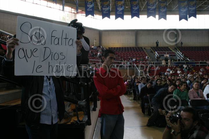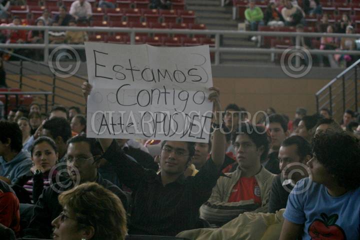 TLALNEPANTLA, ESTADO DE MEXICO 14FEBRERO2006.- Jóvenes muestran pancartas durante el foro Ejercicio Ciudadano del Tecnológico de Monterrey con Felipe Calderón Hinojosa, candidato del PAN a la presidencia de la República. FOTO: Nelly Salas/CUARTOSCURO.COM