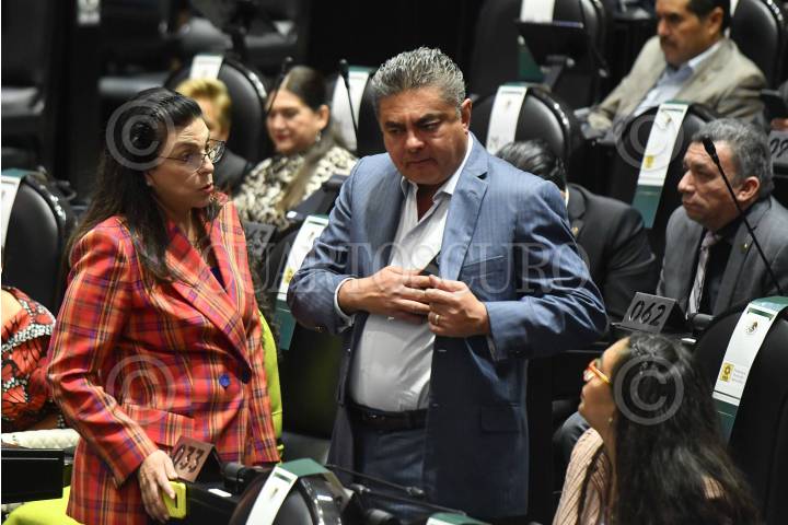 María Clemente García, diputada de Morena, dialoga con su compañero d e bancada Leonel Godoy, durante la sesión ordinaria de la Cámara de Diputados. La legisladora representante de la comunidad LGBTTTIQ ha causado polémica por compartir videos con contenido sexual explícito en sus redes sociales.