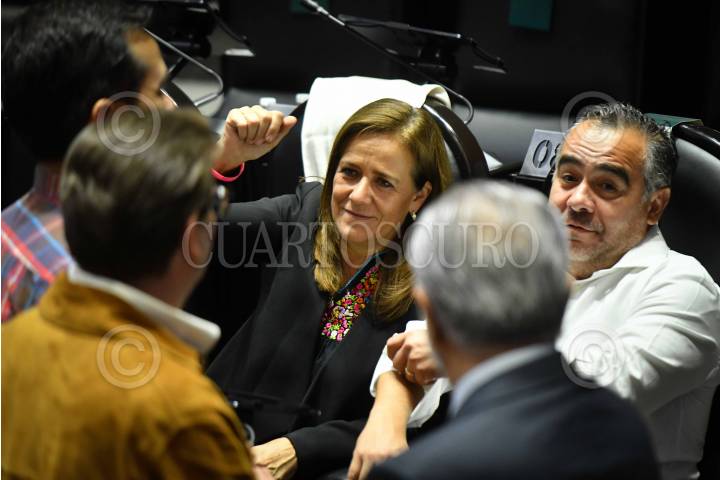 CIUDAD DE MÉXICO, 19SEPTIEMBRE2023.- Margarita Zavala, diputada del PAN, dialoga con Jorge Álvarez Máynes, y Salomón Salomón Chertorivski, diputados de Movimiento Ciudadano, y Fausto Barajas, secretario de Movimientos Sociales de Movimiento Ciudadano, durante la sesión ordinaria de la Cámara de Diputados en la que se realizó el análisis del Quinto Informe de Gobierno del Presidente de la República, en materia de Política Interior y de Política Económica. FOTO: MARIO JASSO/CUARTOSCURO.COM
