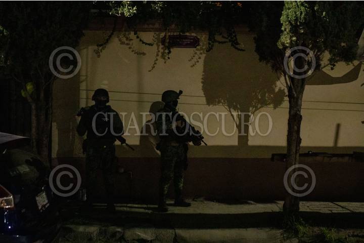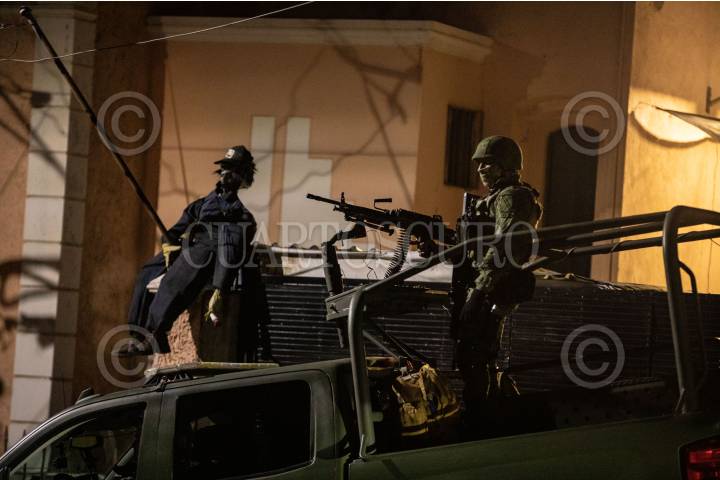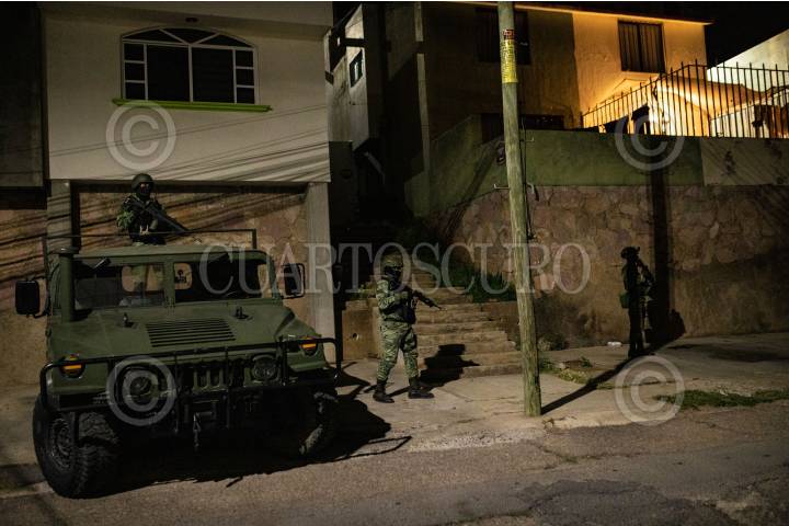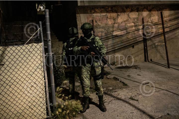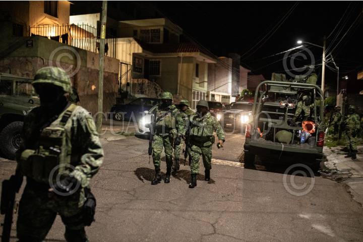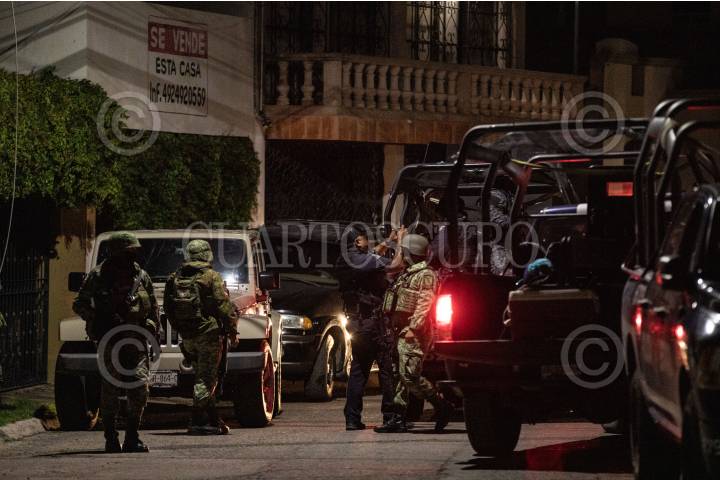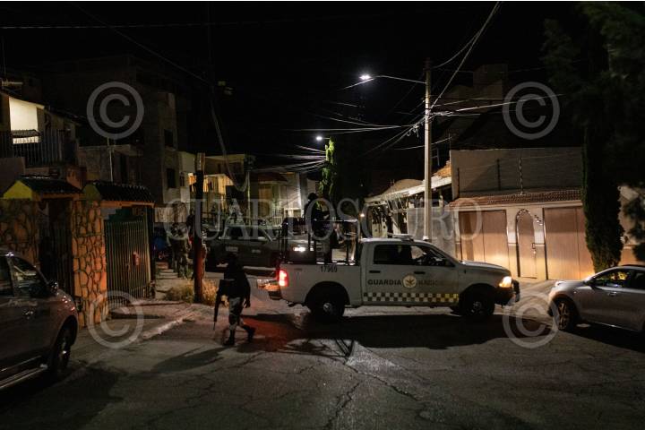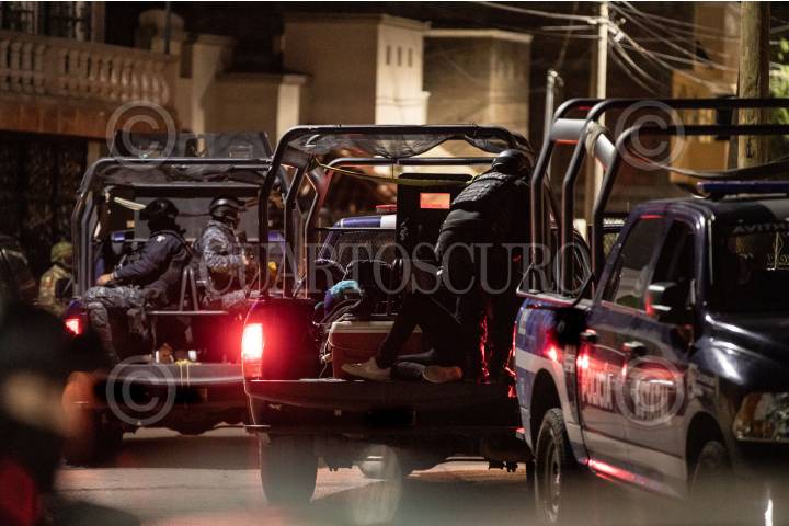 ZACATECAS, ZACATECAS, 03NOVIEMBRE2023.- Detención de cinco hombres y armamento de alto poder, fue el saldo de un enfrentamiento entre elementos de la Fuerza de Reacción Inmediata Zacatecas (FRIZ) y sujetos armados, en la colonia Lomas del Lago de la capital zacatecana. Alrededor de las 18:30 hrs fueron atacados desde un vehículo, elementos de Policía Estatal Preventiva adscritos al FRIZ, cuando realizaban tareas de seguridad sobre la avenida Lago de Chapala; después del intercambio de disparos, los hombres intentaron huir por la calle Lago de Amatitlán, para después tratar de esconderse en un domicilio de la misma calle, ahí fue donde los sujetos fueron detenidos. Tras asegurar la zona por varias corporaciones de seguridad que llegaron de apoyo, los individuos fueron trasladados al Ministerio Público en un fuerte operativo de resguardo. FOTO: GENARO NATERA /CUARTOSCURO.COM