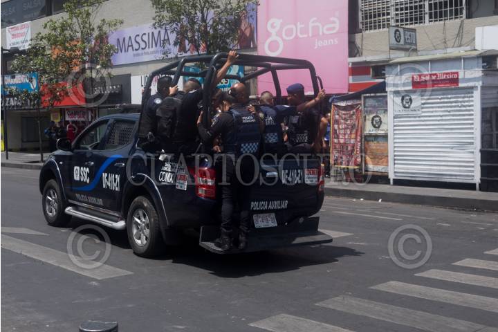 CIUDAD DE MÉXICO, 25ABRIL2019.- Policías Auxiliares de la capital durante una revisión en las calles de José María Izazaga y Avenida Pino Suárez. FOTO: GRACIELA LÓPEZ /CUARTOSCURO.COM