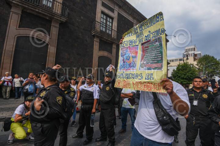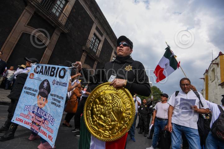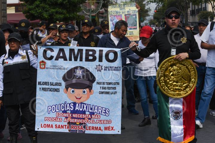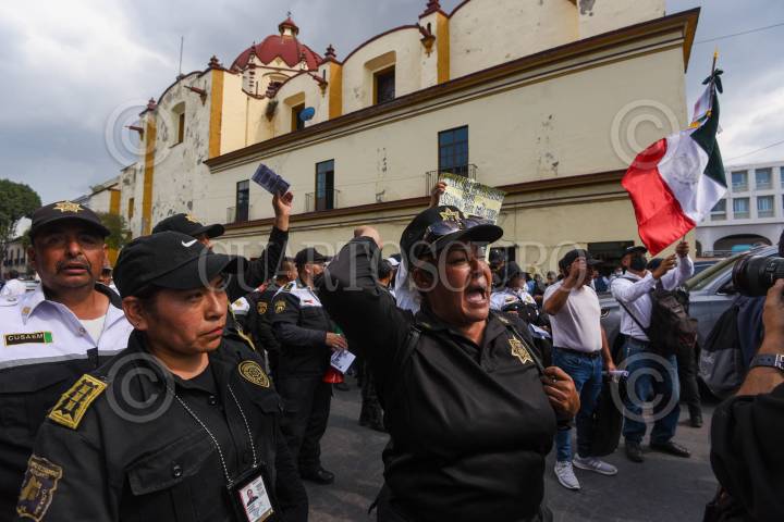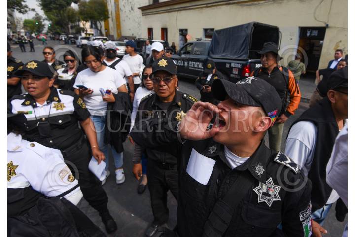 TOLUCA, ESTADO DE MÉXICO, 14SEPTIEMBRE2023.- Policías auxiliares pertenecientes al CUSAEM se manifestaron previo a la toma de protesta de Delfina Gómez como Gobernadora del Estado de México, a un costado de la Cámara de Diputados, exigen mejoras salariales y prestaciones, así como pago de tiempo extra y días festivos. FOTO: CRISANTA ESPINOSA AGUILAR /CUARTOSCURO.COM
