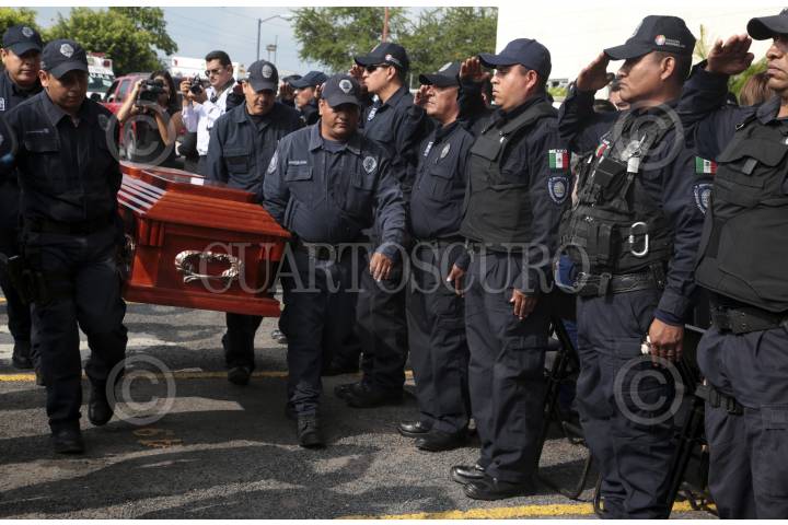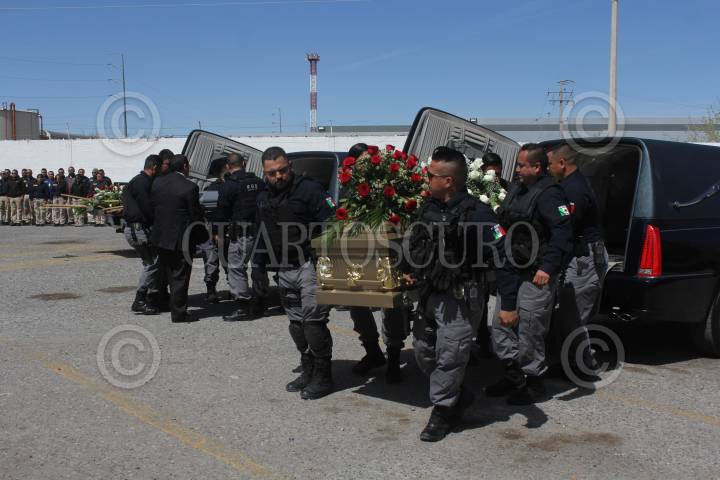 CIUDAD JUÁREZ, CHIHUAHUA, 19MARZO2018.- Compañeros de trabajo, amigos y familiares, así como autoridades de la Fiscalía General del Estado (FGE) Zona Norte, despidieron con honores a los elementos Arturo Ledezma Porras y Saúl Flores Lares, quienes cayeron abatidos la semana pasada mientras desempeñaban sus labores policiales en calles de Ciudad Juárez. La ceremonia de cuerpo presente se efectuó este lunes en el exterior del edificio de la dependencia, donde se hizo una Guardia de Honor y el último Pase de Lista, al que siguieron disparos con salvas y el encendido de las sirenas de las patrullas como despedida. FOTO: NACHO RUIZ /CUARTOSCURO.COM
