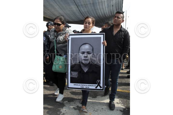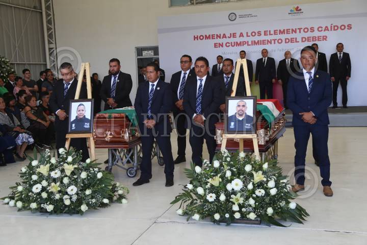 MORELIA, MICHOACÁN, 06FEBRERRO2019. Familiares, amigos, compañeros de trabajo y autoridades de la PGJE dieron el último adiós a Carlos Augusto Hernández y Luis Enrique Hinojosa, agentes de la Policía Ministerial, adscritos al área de homicidios quienes murieron al ser emboscados en el municipio de Ario de Rosales el pasado día lunes. El evento se llevó a cabo en el área de hangares de la Procuraduría General de Justicia del Estado (PGJE), acto solemne en el que se dieron cita familiares, amigos, compañeros de trabajo y autoridades de la dependencia. FOTO: JUAN JOSÉ ESTRADA SERAFÍN /CUARTOSCURO.COM