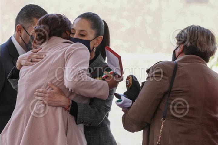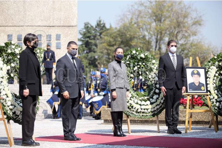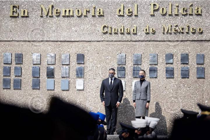 Claudia Sheinbaum, Jefa de Gobierno, y Omar García Harfuch, titular de la SSC, durante la ceremonia de honores a policías caidos en su cumplimiento de su deber.