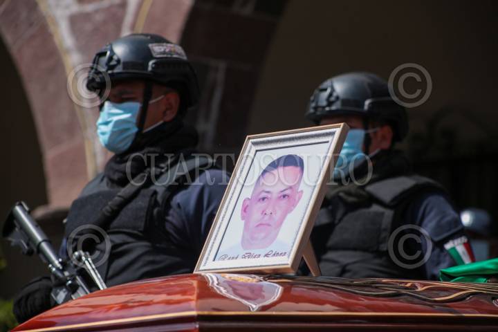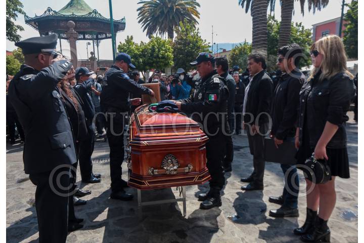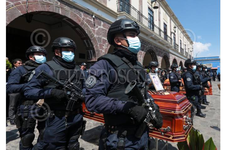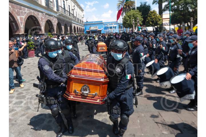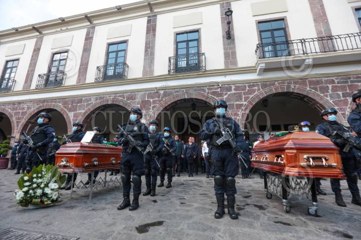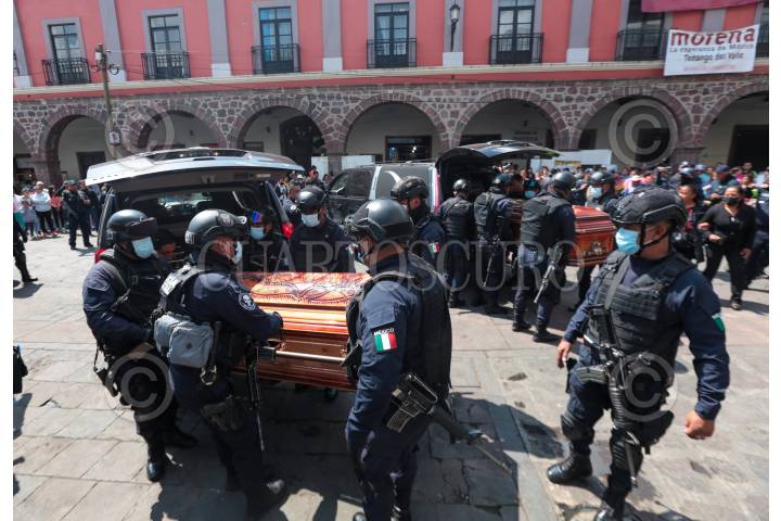 Rinden homenaje de cuerpo presente a los dos policías municipales abatidos por presuntos integrantes del CJNG durante una persecución en Tenango del Valle.