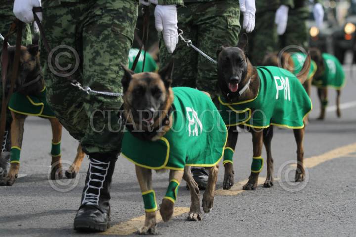 Binomios Caninos de l Policía Militar marcharon durante la Revista del Desfile Militar en las instalaciones del Campo Militar