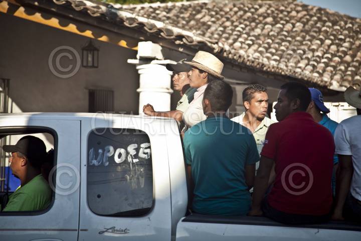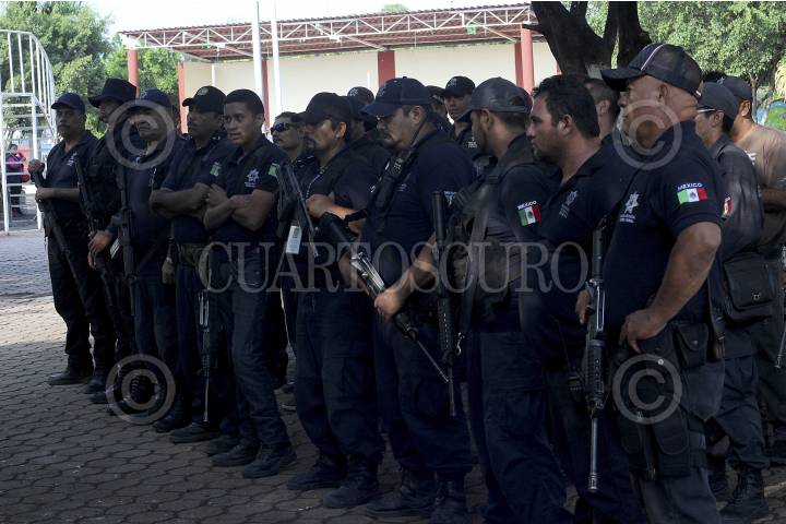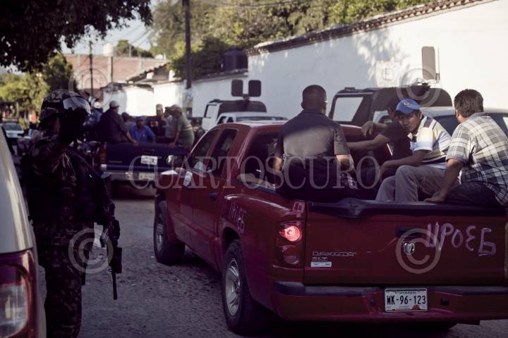 LA RUANA, MICHOACÁN, 25AGOSTO2014.- Policías de la Fuerzas Rurales del grupo de los G100, bajo el mando de Estanislao Beltrán, mejor conocido como papá Pitufo, se concentraron en la plaza principal para realizar estrategias de seguridad para el municipio y sus localidades. FOTO: JUAN JOSÉ ESTRADA SERAFÍN /CUARTOSCURO.COM