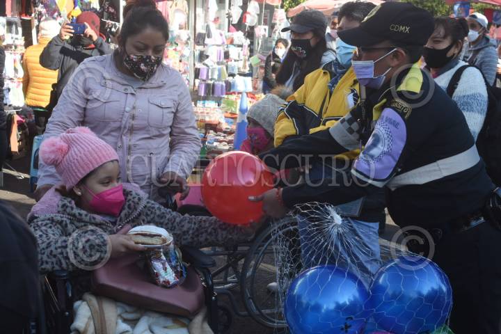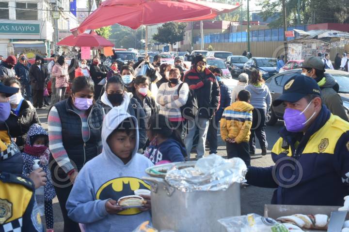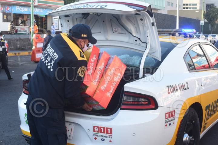 Policías de tránsito repartieron rosca, chocolate caliente y juguetes a los familiares de pacientes que esperan afuera del Hospital General.