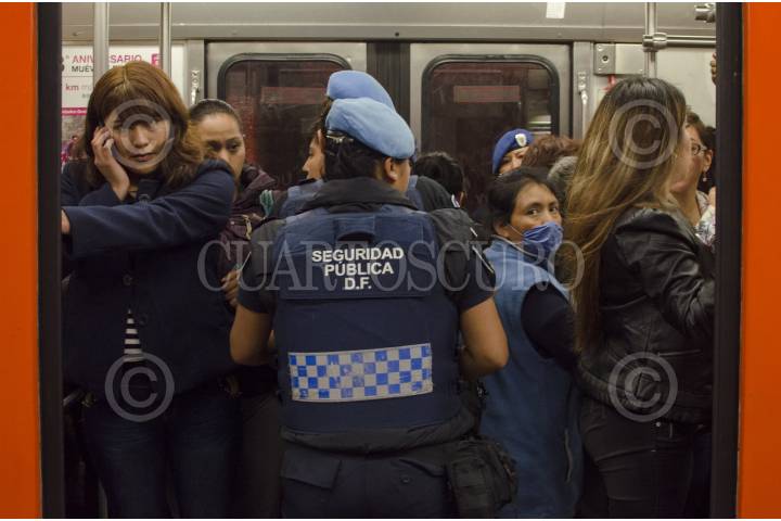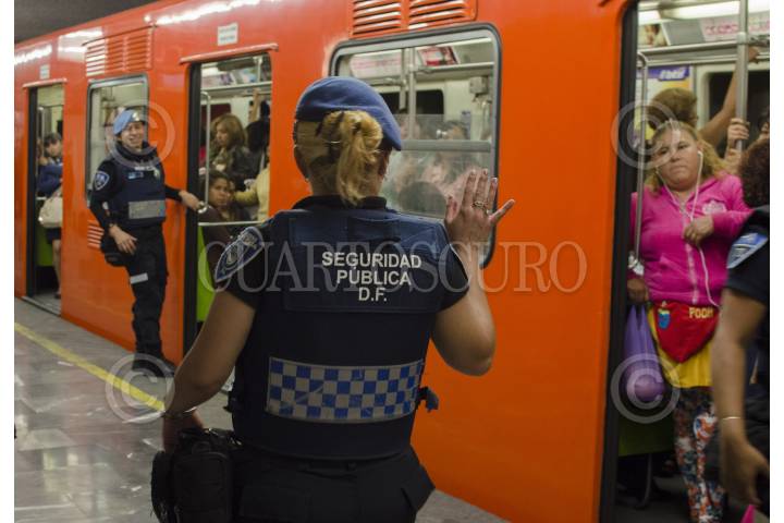 MÉXICO, D.F., 01JULIO2015.- La Secretaría de Seguridad Pública del D.F. dispondrá a partir de hoy 400 policías femeninas que resguardarán, según el objetivo de la SSP, diariamente, los espacios designados para mujeres en el Sistema de Transporte Colectivo Metro y Metrobús. La idea es evitar que los hombres invadan los espacios reservados para las usuarias. FOTO: MARÍA JOSÉ MARTÍNEZ /CUARTOSCURO.COM