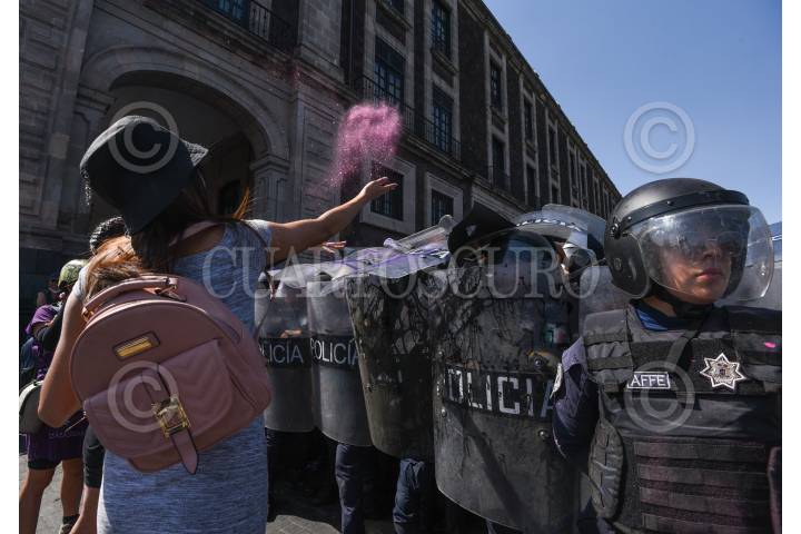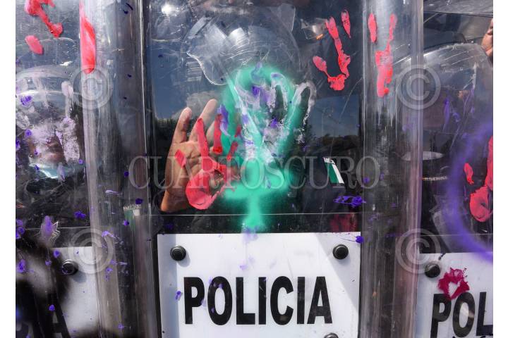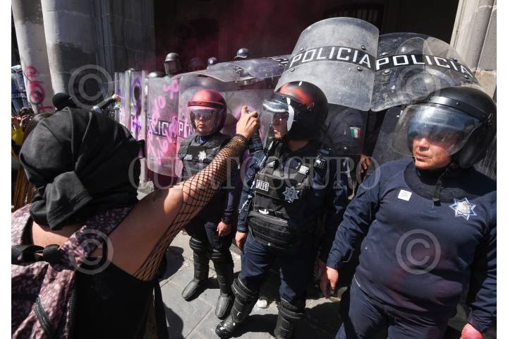 Mujeres policías durante la marcha del 8M en la ciudad de Toluca resguardaron edificios como Palacio de Gobierno.