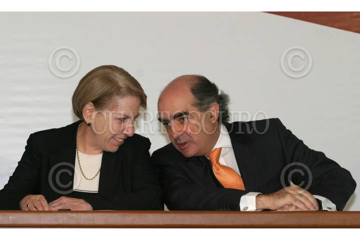 MEXICO, D.F. 21NOVIEMBRE2006.- Georgina Kessel Martínez conversa con Luis Tellez durante la presentación del gabinete económico del presidente electo. FOTO: NELLY SALAS/CUARTOSCURO.COM