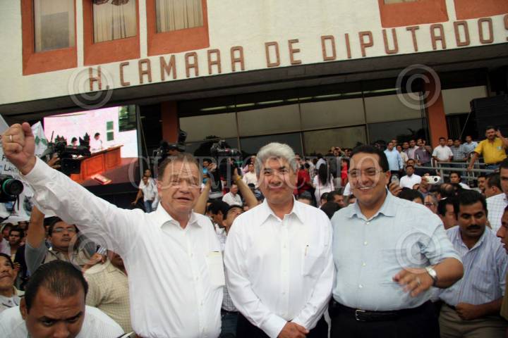 VILLAHERMOSA, TABASCO, 31DICIEMBRE2006.- Andres "El Quimico" Granier Melo, tras tomar protesta como gobernador, en compañia de Francisco Ramirez Acuña, Secretario de Gobernación, y el gobernador saliente; Manuel Andrade Díaz frente a la Cámara de Diputados. FOTO: MARCO POLO GUZMÁN HERNÁNDEZ/CUARTOSCURO.COM