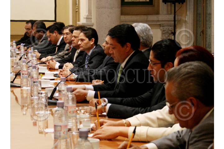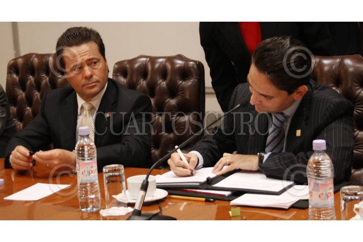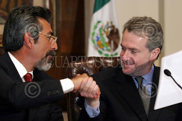 MÉXICO, D.F., 22MAYO2008.- Juan Camilo Mouriño, Secretario de Gobernación, encabezó la firma de los acuerdos en materia de desarrollo social y agricultura que celebraron el gobierno federal y la Conferación Nacional de Gobernadores. En la imagen lo observa el Eduardo Bours, gobernador de Sonora. FOTO: NANCY JUÁREZ/CUARTOSCURO.COM