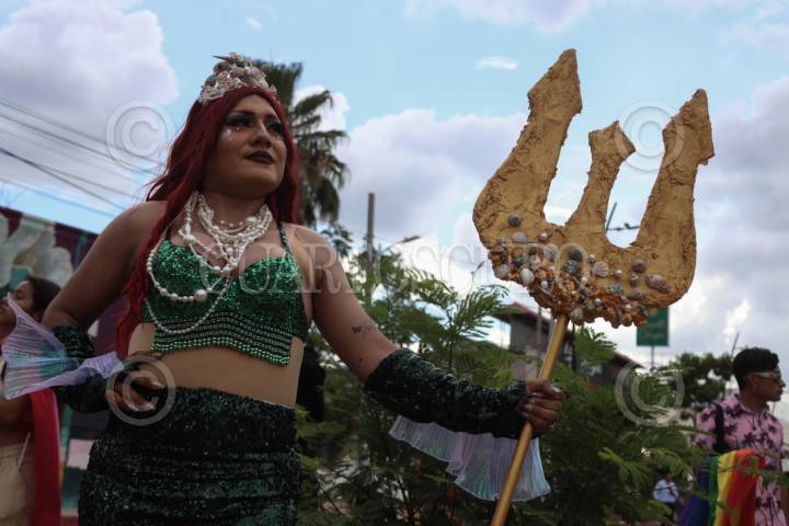TUXTLA GUTIERREZ, CHIAPAS, 14JUNIO2025.- Una mujer transgénero con un atuendo de sirena y un tridente en la mano participa en la marcha del orgullo LGBTTIQ+ en la capital chiapaneca. FOTO: ISABEL MATEOS /CUARTOSCURO.COM