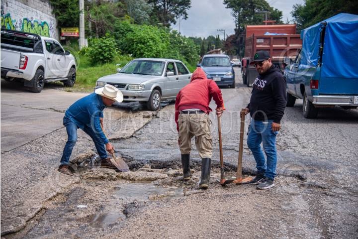 SAN CRISTÓBAL DE LAS CASAS, CHIAPAS, 06JUNIO2025.- Pobladores originarios de San juan Chamula de forma organizada y comunitaria arreglan los baches que con el tiempo y las lluvias solo se hacen más profundos e intransitables las calles. El gobierno municipal y estatal, afirman que la carretera San Juan Chamula - San Cristobal es un tramo federal y por ende corresponde a ellos arreglarlo, por lo cual las calles solo se deterioran y afectan a la población. FOTO: ISABEL MATEOS HINOJOSA /CUARTOSCURO.COM
