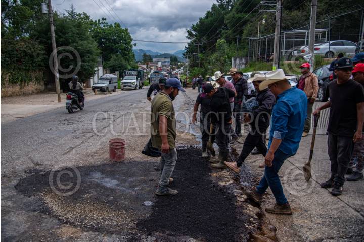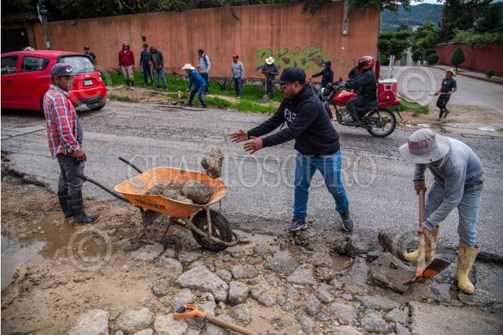 SAN CRISTÓBAL DE LAS CASAS, CHIAPAS, 06JUNIO2025.- Con pico, machete, material de construcción y palas pobladores originarios de San juan Chamula de forma organizada y comunitaria arreglan los baches que con el tiempo y las lluvias solo se hacen más profundos e intransitables las calles. FOTO: ISABEL MATEOS HINOJOSA /CUARTOSCURO.COM