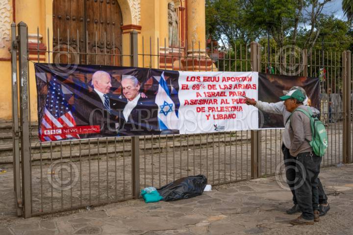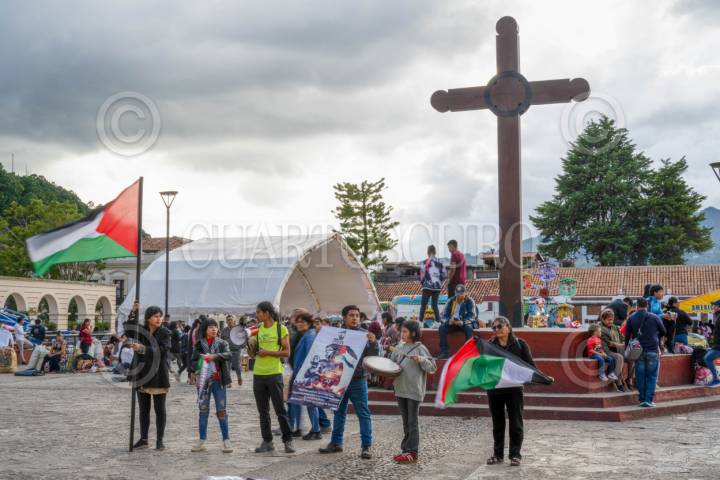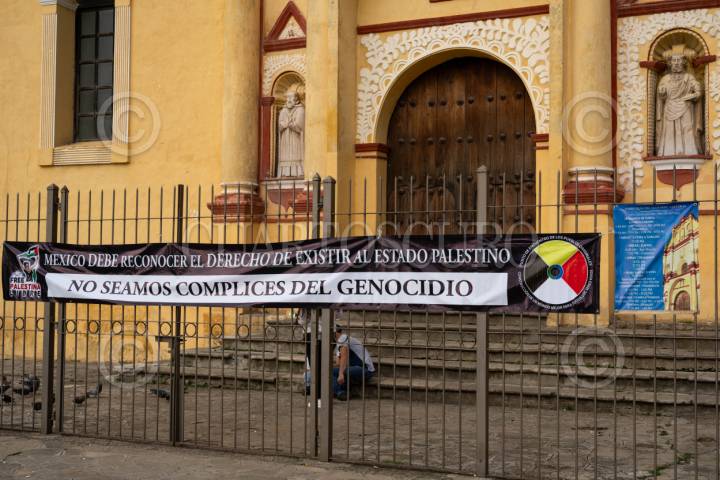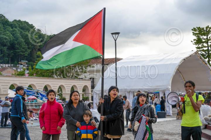 SAN CRISTÓBAL DE LAS CASAS, CHIAPAS, 14SEPTIEMBRE2025.- En la plaza de la paz, ubicada en el centro de la ciudad, el grupo "Chiapas Solidaridad con Palestina", integrado por sociedad civil, realizan cada domingo una manifestación pacífica para exigir el cese a la guerra en Gaza, donde miles de niños, niñas y adultos pierden la vida diariamente a manos del ejército israelí. Dan información y comparten mensajes solidarios con el pueblo palestino en altavoz a la población que transita por la plaza. FOTO: ISABEL MATEOS HINOJOSA/CUARTOSCURO.COM
