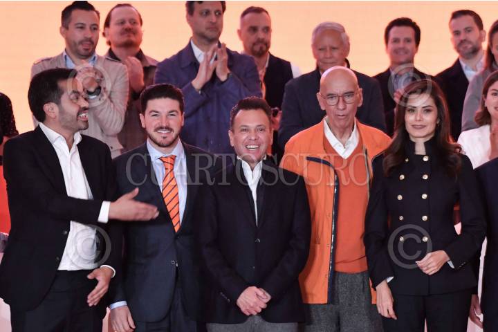 CIUDAD DE MÉXICO, 05DICIEMBRE2024.- Jorge Álvarez Máynez, nuevo dirigente de Movimiento Ciudadano; Samuel García, gobernador de Nuevo León; Jesús Pablo Lemus, gobernador electo de Jalisco, y Dante Delgado, dirigente saliente de Movimiento Ciudadano, durante la Convención Nacional Democrática de MC en la que se renovaron los órganos de la dirección nacional del partido naranja. FOTO: MARIO JASSO/CUARTOSCURO.COM