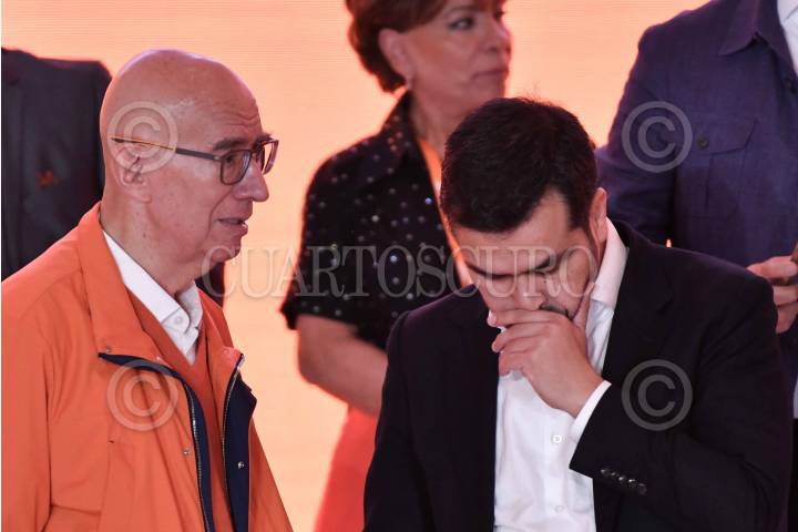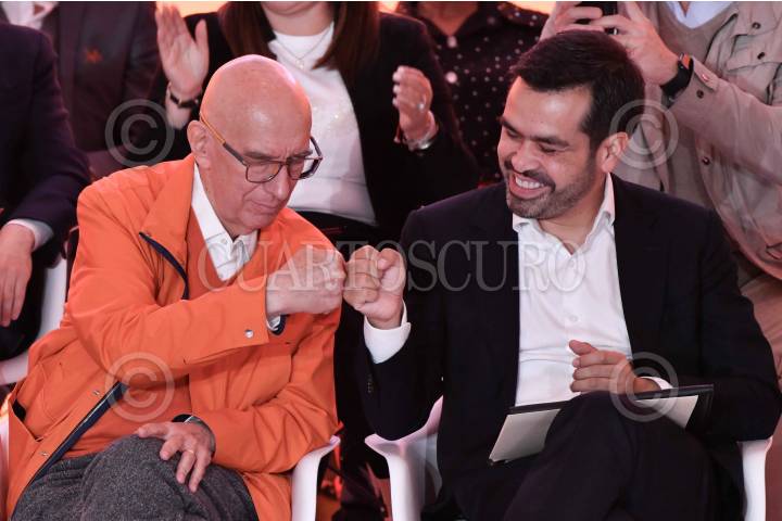 CIUDAD DE MÉXICO, 05DICIEMBRE2024.- Jesús Pablo Lemus, gobernador electo de Jalisco, y Dante Delgado, dirigente saliente de Movimiento Ciudadano, durante la Convención Nacional Democrática de MC en la que se renovaron los órganos de la dirección nacional del partido naranja. FOTO: MARIO JASSO/CUARTOSCURO.COM