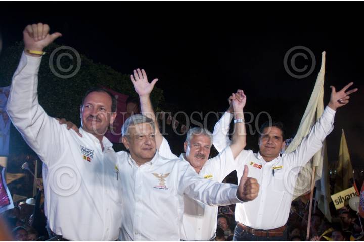 ZAMORA, MICHOACÁN, 09NOVIEMBRE2011.- El precandidato del PRD y dirigente de MORENA, Andrés Manuel López Obrador acudió la noche de hoy al cierre de campaña del candidato del PRD, PT, Convergencia Silvano Aureoles a la gubernatura del estado en el último día de campaña antes de la veda electoral y las eleciones el próximo 13 de Noviembre. FOTO: FRANCISCO RODRÍGUEZ/CUARTOSCURO.COM