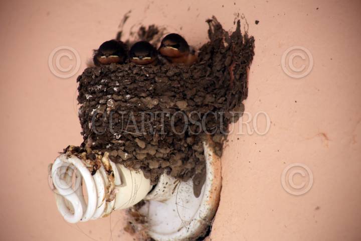 CUERNAVACA, MORELOS, 02JULIO2018.- Tres polluelos de golondrina (Hirunda rústica) se aguardan en el nido que sus padres construyeron sobre el foco de una vivienda. FOTO: MARGARITO PÉREZ RETANA /CUARTOSCURO.COM