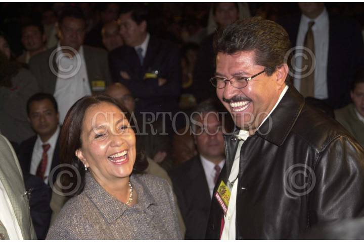 México D.F 05 Mayo 2004.- Amalia García y Ricardo Monreal, gobernador de Zacatecas se saludan en la ceremonia conmemorativa del 15 aniversario del partido de la Revolución Democrática que se llevo a cabo en el centro cultural Siqueiros. FOTO: Eunice Adorno/CUARTOSCURO.COM