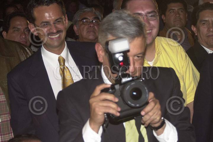 México D.F 05 Mayo 2004.- Andrés Manuel López Obrador jefe de gobierno del D.F realiza una imagen a los fotografos que se encontraban en el centro cultural Siqueiros con motivo del 15 aniversario del partido de la Revolución Democrática. FOTO: Eunice Adorno/CUARTOSCURO.COM