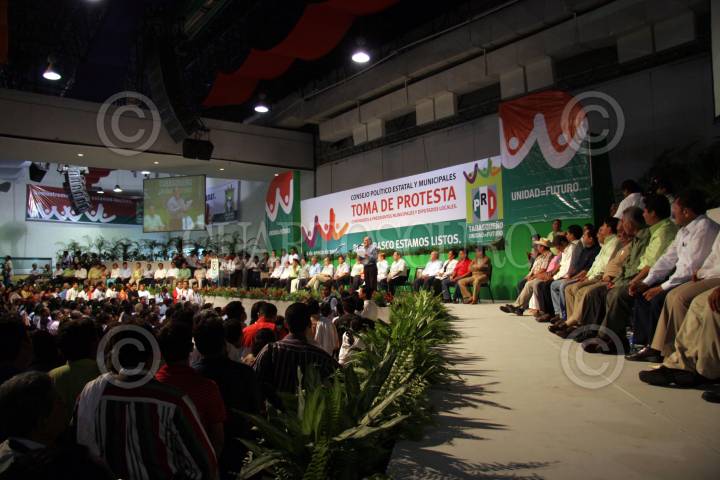 VILLAHERMOSA, TABASCO, 09AGOSTO2006.- Los alrededor 5 mil militantes del PRI que se dieron en el Centro de Convenciones Tabasco Dos Mil observan como se desarrolla el acto del Consejo Politico Estatal y Municipales de la Toma de Protesta a candidatos a diputados locales y presidentes municipales que se celebra en el Centro de Convenciones Tabasco Dos Mil. FOTO: Marco Polo Guzmán Hernández/CUARTOSCURO.COM