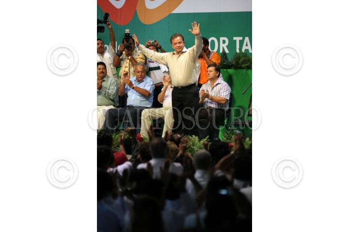 VILLAHERMOSA, TABASCO 09AGOSTO2006.- Andres Granier Melo "El Quimico"; candidato a la gobernatura del Estado por el PRI saluda a los 5 mil militantes que se dieron cita en el acto del Consejo Politico Estatal y Municipales de la Toma de Protesta a candidatos a diputados locales y presidentes municipales que se celebra en el Centro de Convenciones Tabasco Dos Mil. FOTO: Marco Polo Guzmán Hernández/CUARTOSCURO.COM