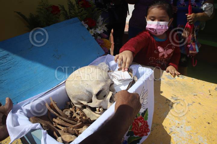 POMUCH, CAMPECHE, 27 DE OCTUBRE 2024.- El silencio se interrumpe en los estrechos pasillos del cementerio de poblado de Pomuch, en la víspera del regreso de las animas. Hoy, los murmullos de las pláticas entre vivos resuenan, mientras comienza el ritual ancestral maya del Choo Ba’ak o limpieza de huesos. Una tradición que se realiza previo al Hanal Pixàn o comida de las animas en el Día de muertos, cuando las familias se reúnen para honrar a sus seres queridos. En este ritual de conexión entre vivos y muertos se limpian y decoran los osarios; cuidadosamente se retiran los huesos limpiándolos uno a uno con brochas o trapos y se reemplaza el manto que los cubre por otro bordado y adornado con flores. Maria Esther Poot Tuz, acompañada de sus familiares y transmitiendo la tradición a los más jóvenes de la familia, realiza la limpieza de trece familiares, tradición que heredo de sus abuelos, ella explica que la limpieza de huesos, simboliza un baño para los difuntos, mientras que el cambio de manto representa la ropa nueva que usaran las almas del regreso del mas allá. Los hermanos Ermilo Pool y Manuel Pool, también mantienen la tradición, cada año ambos acuden al cementerio para realizar la limpieza de sus familiares. Manuel, quien perdió a su hija a temprana edad sigue preservando este acto como un homenaje a sus familiares y que prometió acudir hasta que sea llamado para reunirse con ellos. FOTO: MICHEL BALAM/ CUARTOSCURO.COM