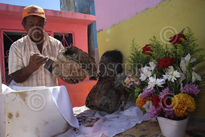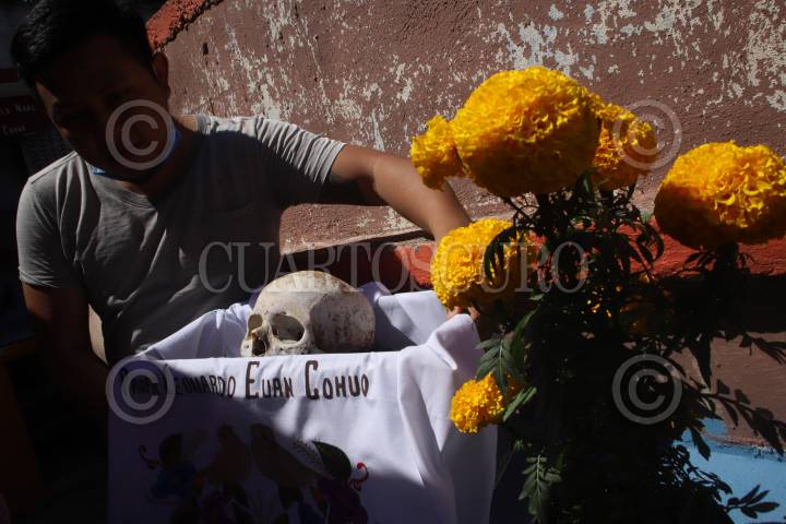 POMUCH, CAMPECHE, 27 DE OCTUBRE 2024.- El silencio se interrumpe en los estrechos pasillos del cementerio de poblado de Pomuch, en la víspera del regreso de las animas. Hoy, los murmullos de las pláticas entre vivos resuenan, mientras comienza el ritual ancestral maya del Choo Ba’ak o limpieza de huesos. Una tradición que se realiza previo al Hanal Pixàn o comida de las animas en el Día de Muertos, cuando las familias se reúnen para honrar a sus seres queridos. En este ritual de conexión entre vivos y muertos se limpian y decoran los osarios; cuidadosamente se retiran los huesos limpiándolos uno a uno con brochas o trapos y se reemplaza el manto que los cubre por otro bordado y adornado con flores. Maria Esther Poot Tuz, acompañada de sus familiares y transmitiendo la tradición a los más jóvenes de la familia, realiza la limpieza de trece familiares, tradición que heredo de sus abuelos, ella explica que la limpieza de huesos, simboliza un baño para los difuntos, mientras que el cambio de manto representa la ropa nueva que usaran las almas del regreso del mas allá. Los hermanos Ermilo Pool y Manuel Pool, también mantienen la tradición, cada año ambos acuden al cementerio para realizar la limpieza de sus familiares. Manuel, quien perdió a su hija a temprana edad sigue preservando este acto como un homenaje a sus familiares y que prometió acudir hasta que sea llamado para reunirse con ellos. FOTO: MICHAEL BALAM, CUARTOSCURO.COM