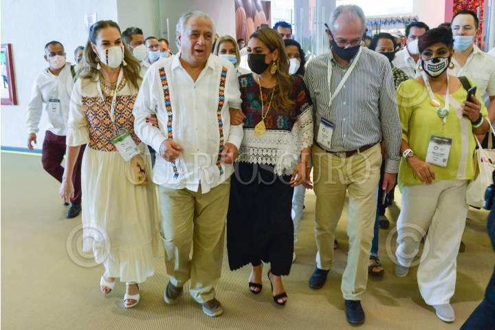 Miguel Torruco, secretario de Turismo, acompañado de su esposa Gloria María Garza, y Evelyn Salgado, gobernadora de Guerrero, mientras se desarrolla el segundo día de actividad del Tianguis Turístico Mérida 2021 en el Centro de Exposiciones y Convenciones Siglo XXI.