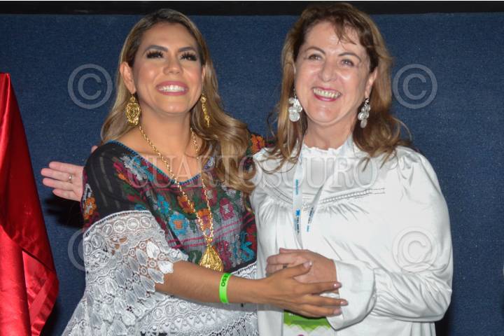 Evelyn Salgado, gobernadora de Guerrero, y Margarita González Sarabia, directora general de Lotería Nacional, durante la develación del billete conmemorativo de la edición 45 del Tianguis Turístico México.