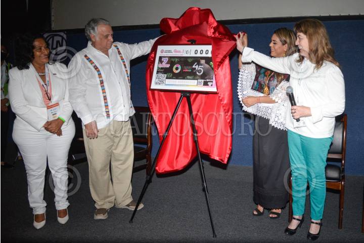 Evelyn Salgado, gobernadora de Guerrero, y Miguel Torruco, secretario de Turismo, y Margarita González Sarabia, directora general de Lotería Nacional, encabezaron la develación del billete conmemorativo de la edición 45 del Tianguis Turístico México.
