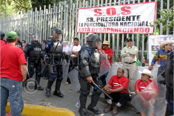 MÉXICO D.F., 30ENERO2008.- Porcicultores de los estados de Michoacán, Jalisco, entre otros, llegaron a la Secretaria de Economía para pedir programas de apoyo. FOTO: PEDRO MARRUFO/CUARTOSCURO.COM
