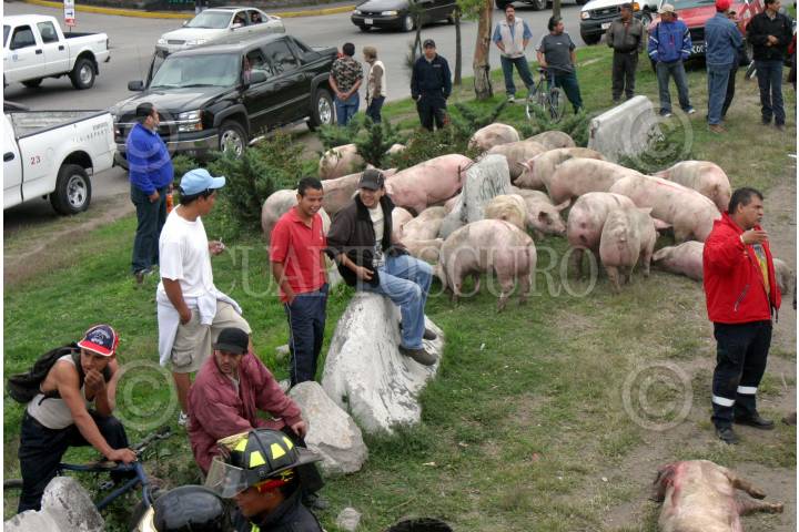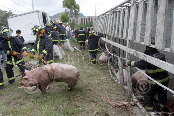 MÉXICO, D.F., 27SEPTIEMBRE2007.- Un trailer que transportaba decenas de cerdos se volco enfrente del Panteón Jardines del Recuerdo sobre la avenida del Durazno en Tlanepantla cuando el chofer quiso tomar una curva sin precaución , los bomberos acudieron al lugar para recoger los cadaveres de los puercos que quedaron prensados entre los fierros de remolque. FOTO: PEDRO MARRUFO/CUARTOSCURO.COM