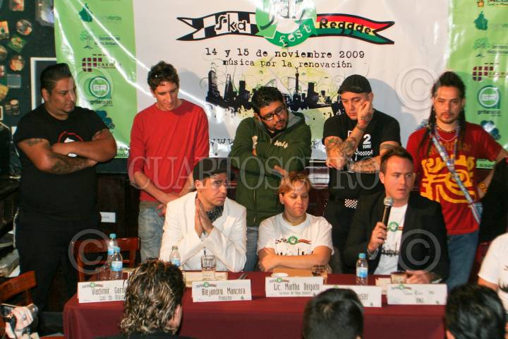 MÉXICO, D.F., 20OCTUBRE2009.- Martha Delgado, secretaria del medio ambiente junto a integrantes del grupo, Inspector, Los de Abajo y Rastrillos, ofrecieron una conferencia para dar los pormenores del "Jah Festival" música por la renovación donde participaran varias bandas de la escena ska y reggae. Dicho evento tendrá lugar los días 15 y 16 de noviembre. FOTO: ENRIQUE ORDÓÑEZ/CUARTOSCURO.COM