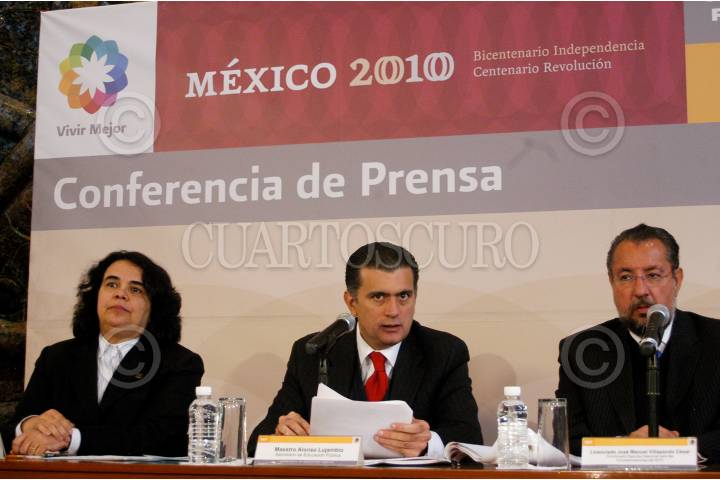 MÉXICO D.F., 08NOVIEMBRE2010.- Alonso Lujambio, Secretario de Educación Publica, acompañado de Consuelo Sáizar, Presidenta de COACULTA y Manuel Villalpando, Coordinador Ejecutivo Nacional para las Conmemoraciones del 2010, dio a conocer los pormenores del próximo festejo del Centenario de la Revolución Mexicana. FOTO: GUILLERMO PEREA/CUARTOSCURO.COM