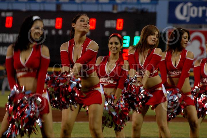 VERACRUZ, VERACRUZ, 27MAYO2008.- Guapas edecanes de conocida marca refresquera deleitan con su baile a los asistentes del estadio "Beto Ávila", donde el Águila de Veracruz se impuso cinco carreras a cuatro ante los Guerreros de Oaxaca en el primer juego de la serie. FOTO: JOSÉ CANDELARIO/CUARTOSCURO.COM