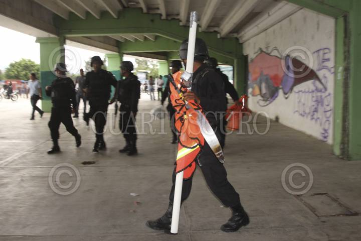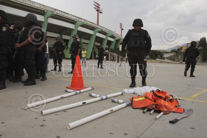 OAXACA, OAXACA, 23AGOSTO2011.- Un grupo de porros presuntamente contratados por el síndico municipal del ayuntamiento de Santa Lucía del Camino resguardaron las inmediaciones del estadio Benito Juárez, con lo que trataban de impedir la instalación de un grupo de comerciantes. Los porros fueron resguardados en todo momento por la policía municipal. Al arribo de la policía estatal se retiraron, entre las cosas que olvidaron se encontraron basucas caseras, estopa y un machete. FOTO: ARTURO PÉREZ ALFONSO/CUARTOSCURO.COM